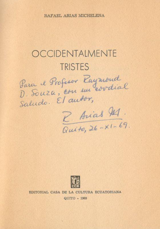 Add to basket8°. 103 pages. Original brochure. Envoi autographe signé de Rafael Arias Michelena à Raymond D. Souza. / Signed and inscribed by Rafel Arias Michelena to Raymond D. Sousa in Quito in 1969. Sprache: français.