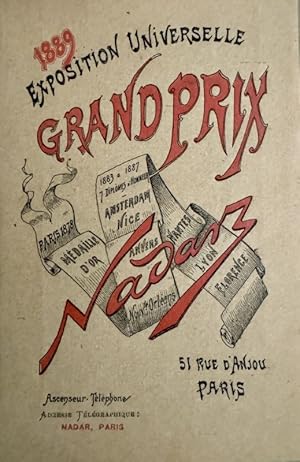 gr. in-8, cartonnage bradel doré avec couvertures contrecollées, 48 pp. + 14 p. de publicités in-fine, portrait photographique de Daguerre en héliogravure et fac-similé dépliant du traité original signé par Nicéphore Niepce et Daguerre. On joint le carton dépliant de 6 pp. servant de catalogue à Nadar, annonçant fièrement son grand prix à l'Exposition universelle de 1889, encollé au contreplat. Manque la planche de photographies de Sarah Bernhardt. L'une des publicités a été en partie découpée. Dos fragilisé avec manques de carton. Très rare. En l'état. Seller Inventory # 117523