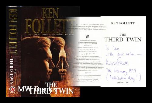 Add to basketFine cloth copy in an equally fine dw. Particularly and surprisingly well-preserved; tight, bright, clean and especially sharp-cornered. SIGNED, inscribed and dated by the author.; 8vo 8" - 9" tall; 504 pages; Physical description. : 504 p. ; 24 cm. Subject: Twins - Fiction. Cloning - Fictiion. Cloning - Fiction. Summary: The third twin could be your lover, your friend .or your killer. In the course of her work, scientist Jeannie Ferrami stumbles across a baffling mystery: Steve and Dan appear to be identical twins, but were born on different days, to different mothers. A law student and a convicted murderer, they seem a world apart, but as Jeannie begins to fall in love with Steve, she finds her professional - and personal - future threatened. Steve is accused of a terrible crime, and Jeannie is forced to question just how different the two men really are. Together, she and Steve investigate the mystery and uncover all the secrets. But perhaps some secrets are best left alone .A thrilling, chilling story of hidden evil, set at the forefront of modern technology, "The Third Twin" is a heart-stopping, spine-tingling story from master of suspense, Ken Follett. 1 Kg.